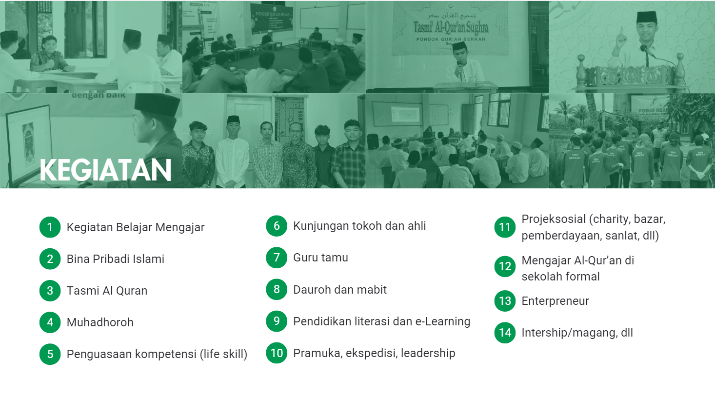 - Mengajarkan kemampuan membaca Alquran dengan standar tahsin dan tartil (membaca sesuai aturan hukum tajwid), dan kemampuan menghafal Al Quran (tahfizhul Qur’an) minimal 6 juz.